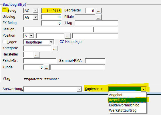 Der Schadensbeleg wird aus der Originalrechnung kopiert und bearbeitet. Dafür suchen wir den Kundenbeleg über die vorher notierte Rechnungsnummer und kopieren diese in einen neuen Beleg