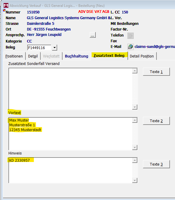 Im Reiter "Zusatztext Beleg" müssen die Felder wie folgt ausgefüllt werden.
