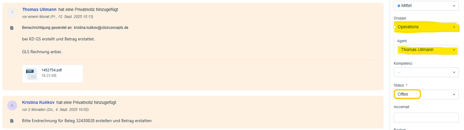 Hierzu erstellen wir eine Notiz im Ticket in Freshdesk mit der Bitte die Endrechnung zu erstellen. Das Ticket wird direkt an Thomas zugewiesen.