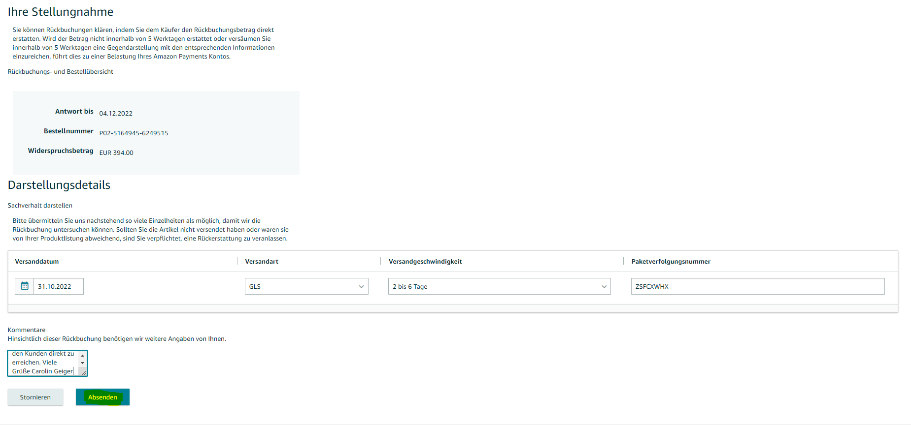 Bei der Stellungnahme werden die Versanddaten eingegeben sowie eine kurze Erklärung zum Fall beschrieben.