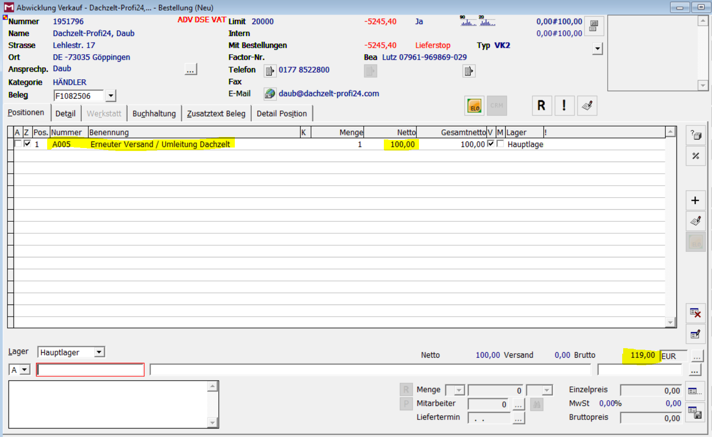 - Ist dass der Fall, so informieren wir die Spedition darüber und leiten eine Versand Umleitung ein. Hier kommen dann noch Zusätzliche Versandkosten von 100,-€ Netto auf, welche wir an den Händler weiterberechnen. (Über den Newsletter ging die Information bereits an den Händler)